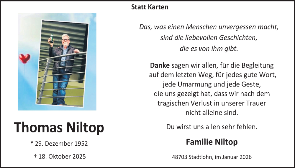 Hier finden Sie alle Traueranzeigen aus der Zeitung, die bisher für Thomas Niltop erschienen sind. Weitere Traueranzeigen, die in der Zeitung erscheinen, werden hier ebenfalls aufgelistet