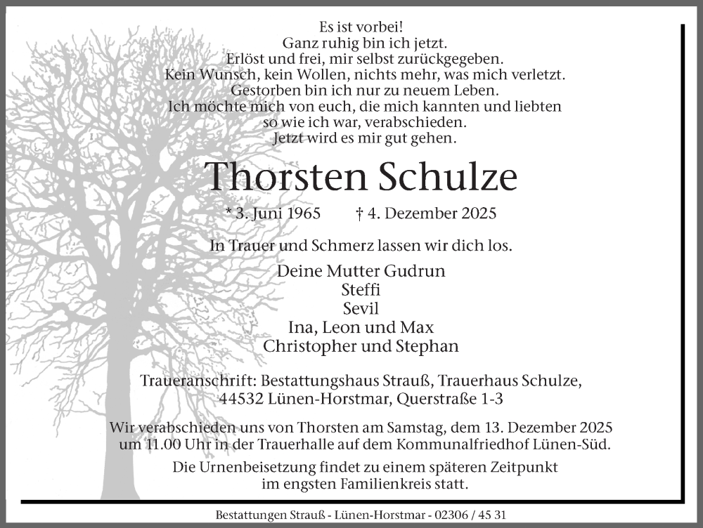 Hier finden Sie alle Traueranzeigen aus der Zeitung, die bisher für Thorsten Schulze erschienen sind. Weitere Traueranzeigen, die in der Zeitung erscheinen, werden hier ebenfalls aufgelistet