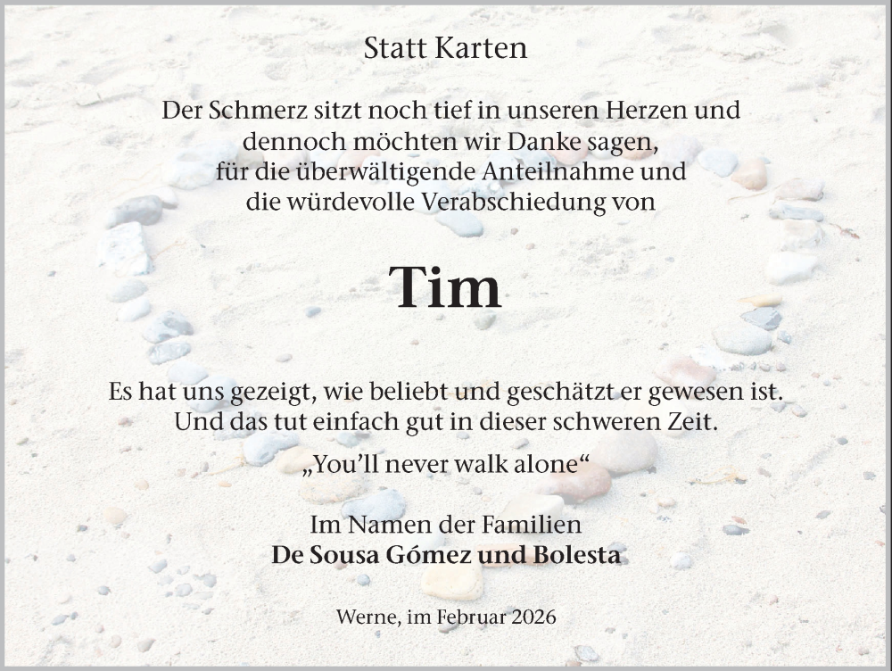 Hier finden Sie alle Traueranzeigen aus der Zeitung, die bisher für Tim Bolesta erschienen sind. Weitere Traueranzeigen, die in der Zeitung erscheinen, werden hier ebenfalls aufgelistet