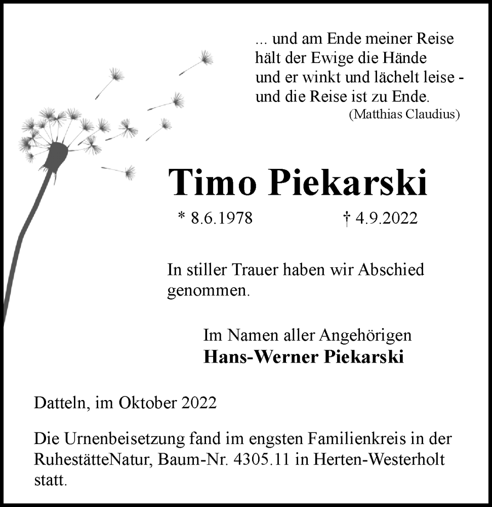 Hier finden Sie alle Traueranzeigen aus der Zeitung, die bisher für Timo Piekarski erschienen sind. Weitere Traueranzeigen, die in der Zeitung erscheinen, werden hier ebenfalls aufgelistet