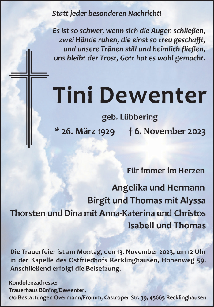 Hier finden Sie alle Traueranzeigen aus der Zeitung, die bisher für Tini Dewenter erschienen sind. Weitere Traueranzeigen, die in der Zeitung erscheinen, werden hier ebenfalls aufgelistet