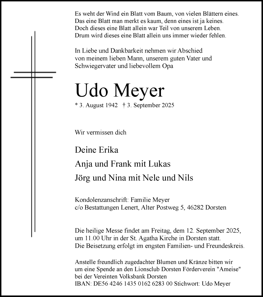 Hier finden Sie alle Traueranzeigen aus der Zeitung, die bisher für Udo Meyer erschienen sind. Weitere Traueranzeigen, die in der Zeitung erscheinen, werden hier ebenfalls aufgelistet