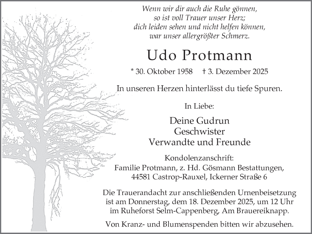 Hier finden Sie alle Traueranzeigen aus der Zeitung, die bisher für Udo Protmann erschienen sind. Weitere Traueranzeigen, die in der Zeitung erscheinen, werden hier ebenfalls aufgelistet
