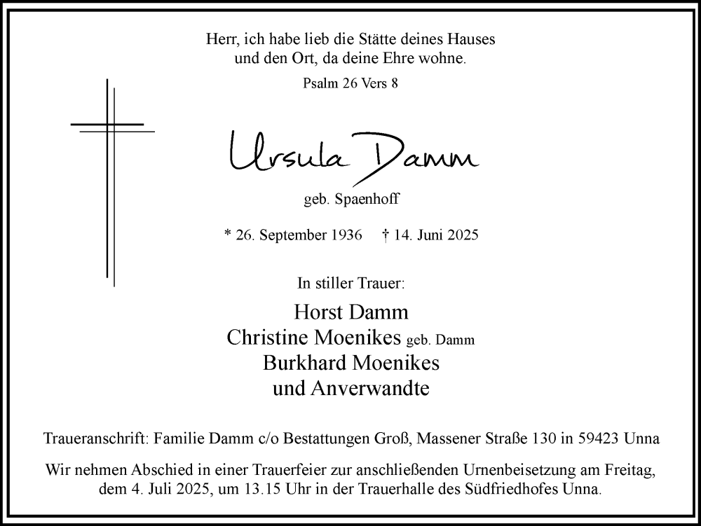 Hier finden Sie alle Traueranzeigen aus der Zeitung, die bisher für Ursula Damm erschienen sind. Weitere Traueranzeigen, die in der Zeitung erscheinen, werden hier ebenfalls aufgelistet