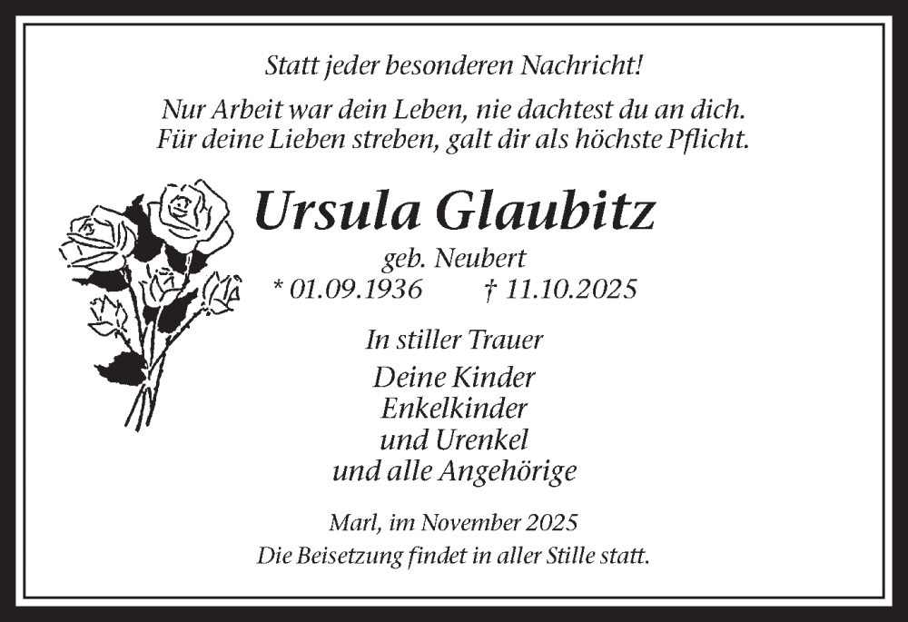 Hier finden Sie alle Traueranzeigen aus der Zeitung, die bisher für Ursula Glaubitz erschienen sind. Weitere Traueranzeigen, die in der Zeitung erscheinen, werden hier ebenfalls aufgelistet