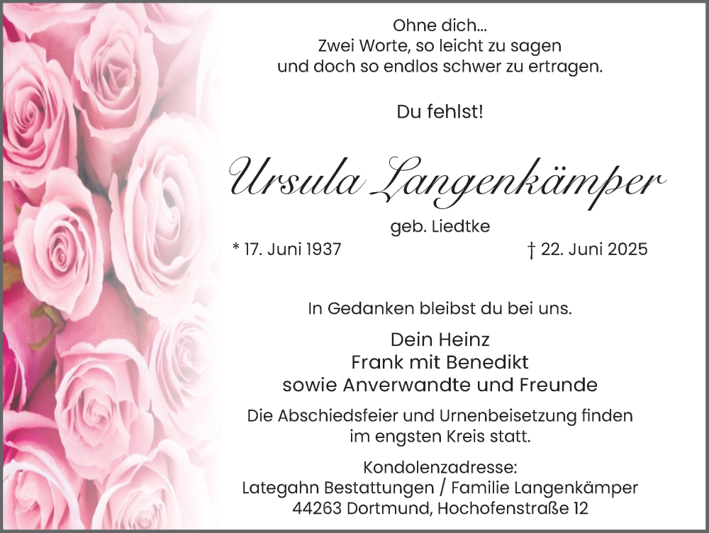 Hier finden Sie alle Traueranzeigen aus der Zeitung, die bisher für Ursula Langenkämper erschienen sind. Weitere Traueranzeigen, die in der Zeitung erscheinen, werden hier ebenfalls aufgelistet