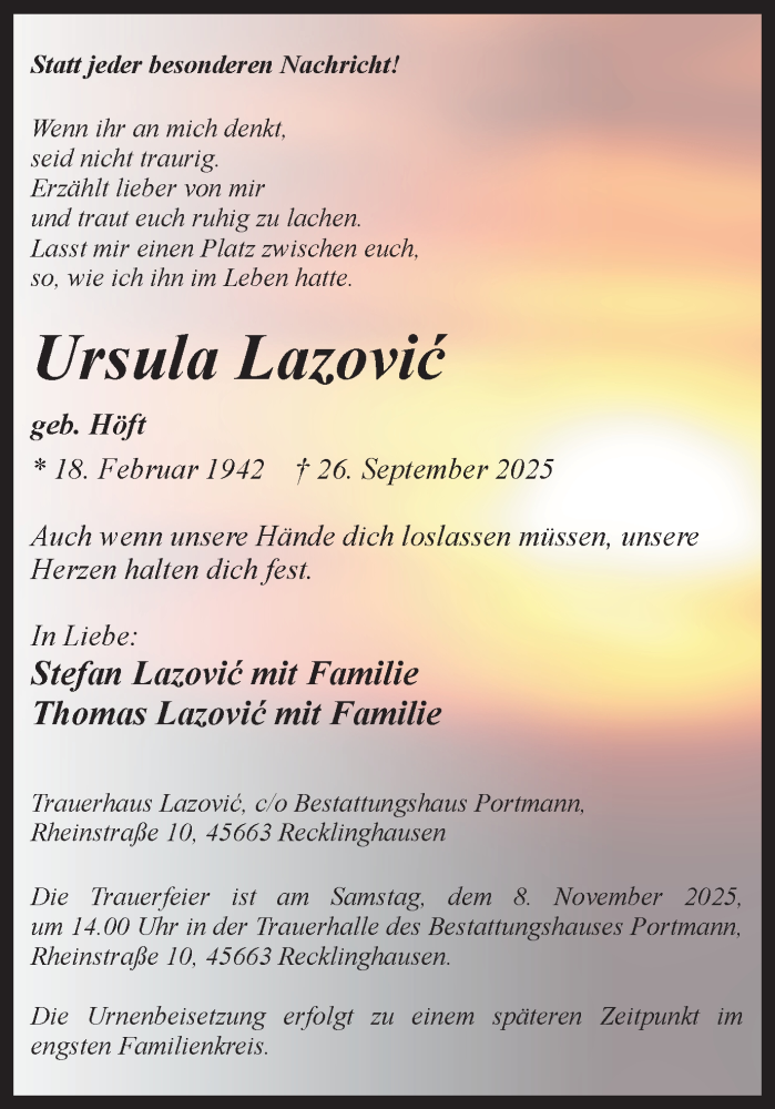 Hier finden Sie alle Traueranzeigen aus der Zeitung, die bisher für Ursula Lazovic erschienen sind. Weitere Traueranzeigen, die in der Zeitung erscheinen, werden hier ebenfalls aufgelistet