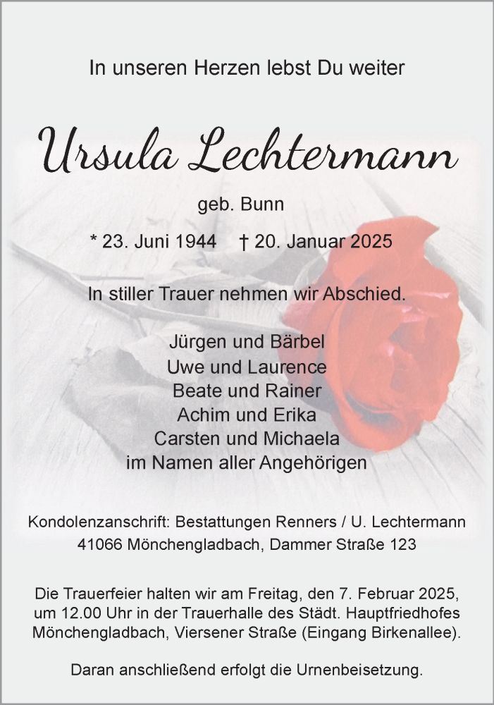 Hier finden Sie alle Traueranzeigen aus der Zeitung, die bisher für Ursula Lechtermann erschienen sind. Weitere Traueranzeigen, die in der Zeitung erscheinen, werden hier ebenfalls aufgelistet