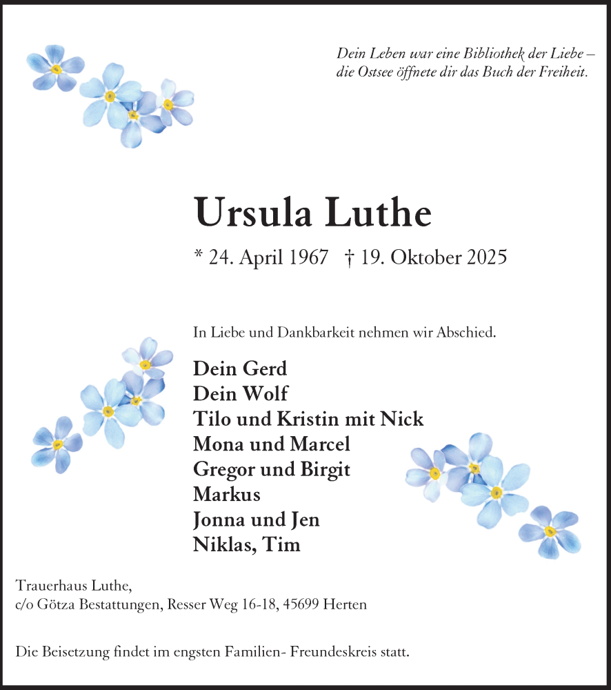 Hier finden Sie alle Traueranzeigen aus der Zeitung, die bisher für Ursula Luthe erschienen sind. Weitere Traueranzeigen, die in der Zeitung erscheinen, werden hier ebenfalls aufgelistet