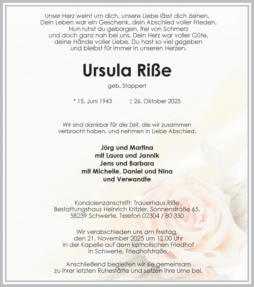 Hier finden Sie alle Traueranzeigen aus der Zeitung, die bisher für Ursula Riße erschienen sind. Weitere Traueranzeigen, die in der Zeitung erscheinen, werden hier ebenfalls aufgelistet