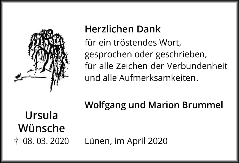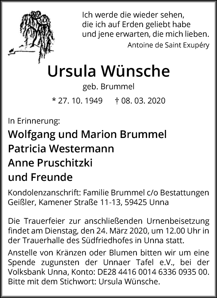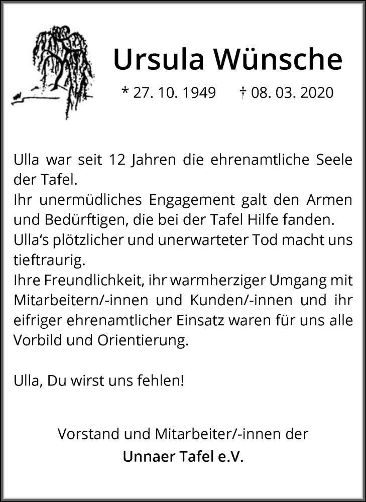 Hier finden Sie alle Traueranzeigen aus der Zeitung, die bisher für Ursula Wünsche erschienen sind. Weitere Traueranzeigen, die in der Zeitung erscheinen, werden hier ebenfalls aufgelistet