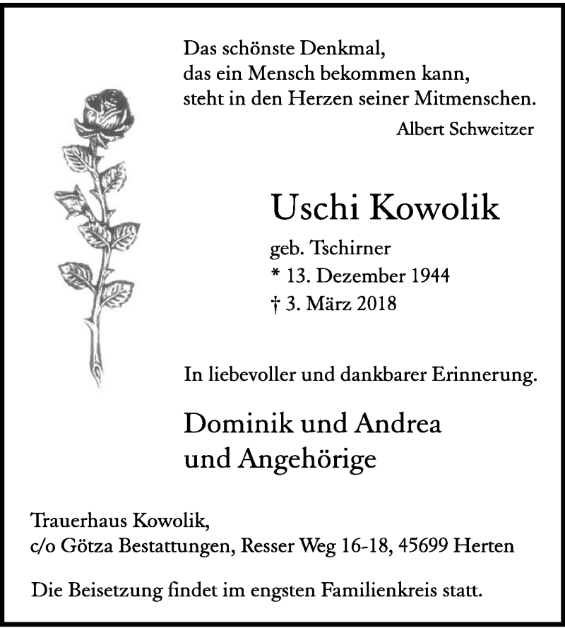 Hier finden Sie alle Traueranzeigen aus der Zeitung, die bisher für Uschi Kowolik erschienen sind. Weitere Traueranzeigen, die in der Zeitung erscheinen, werden hier ebenfalls aufgelistet