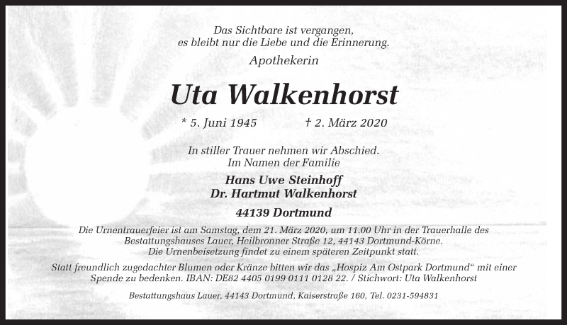 Hier finden Sie alle Traueranzeigen aus der Zeitung, die bisher für Uta Walkenhorst erschienen sind. Weitere Traueranzeigen, die in der Zeitung erscheinen, werden hier ebenfalls aufgelistet