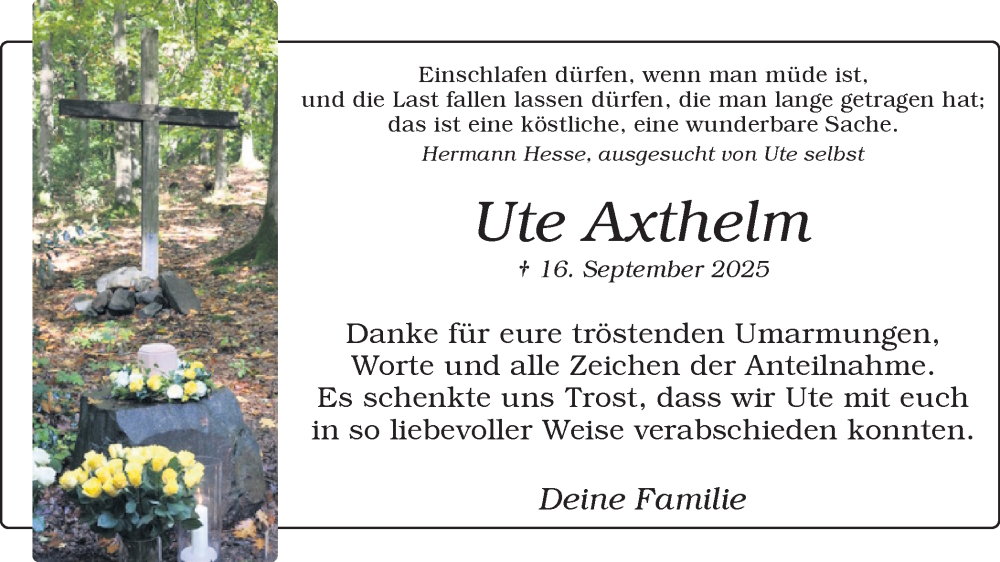 Hier finden Sie alle Traueranzeigen aus der Zeitung, die bisher für Ute Axthelm erschienen sind. Weitere Traueranzeigen, die in der Zeitung erscheinen, werden hier ebenfalls aufgelistet