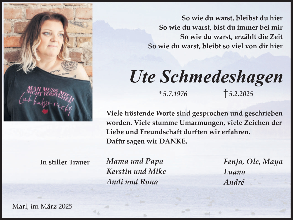 Hier finden Sie alle Traueranzeigen aus der Zeitung, die bisher für Ute Schmedeshagen erschienen sind. Weitere Traueranzeigen, die in der Zeitung erscheinen, werden hier ebenfalls aufgelistet