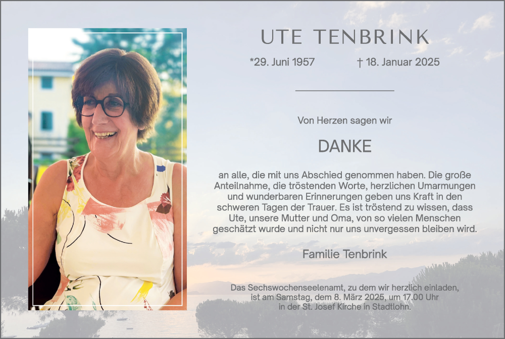Hier finden Sie alle Traueranzeigen aus der Zeitung, die bisher für Ute Tenbrink erschienen sind. Weitere Traueranzeigen, die in der Zeitung erscheinen, werden hier ebenfalls aufgelistet