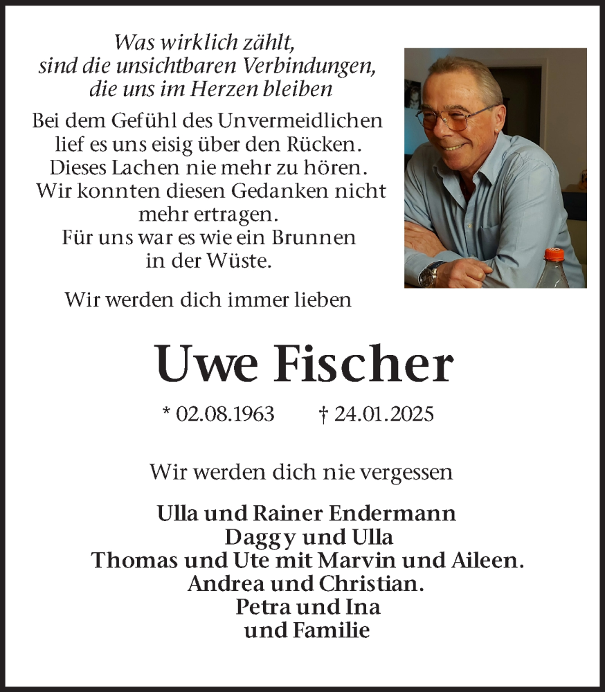 Hier finden Sie alle Traueranzeigen aus der Zeitung, die bisher für Uwe Fischer erschienen sind. Weitere Traueranzeigen, die in der Zeitung erscheinen, werden hier ebenfalls aufgelistet