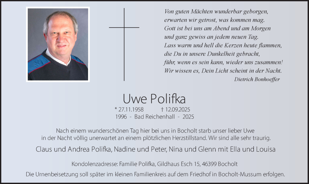 Hier finden Sie alle Traueranzeigen aus der Zeitung, die bisher für Uwe Polifka erschienen sind. Weitere Traueranzeigen, die in der Zeitung erscheinen, werden hier ebenfalls aufgelistet