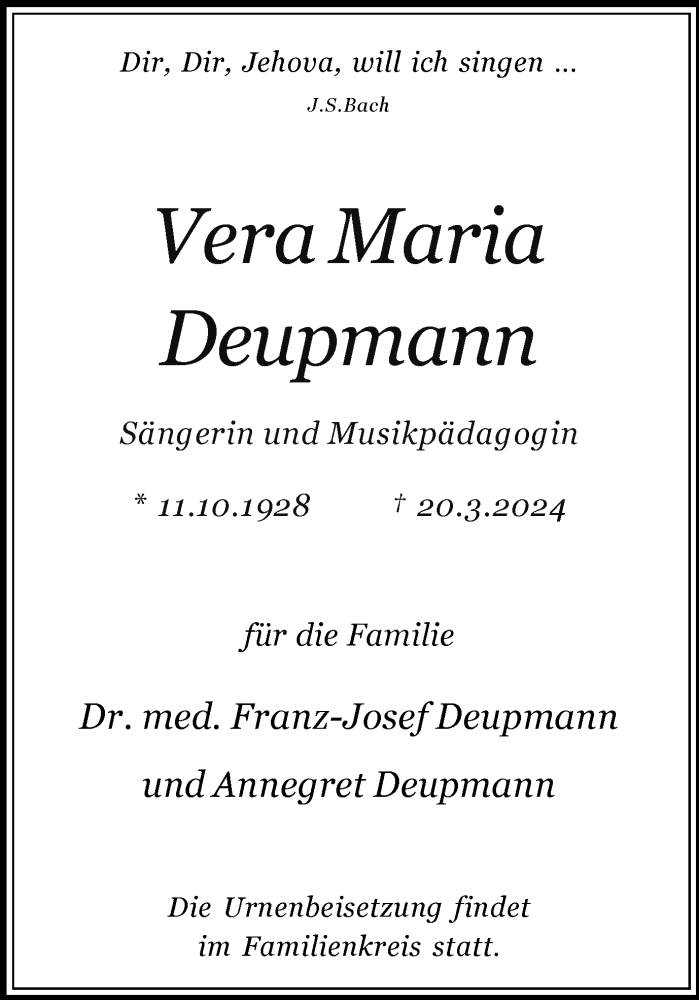 Hier finden Sie alle Traueranzeigen aus der Zeitung, die bisher für Vera Maria Deupmann erschienen sind. Weitere Traueranzeigen, die in der Zeitung erscheinen, werden hier ebenfalls aufgelistet