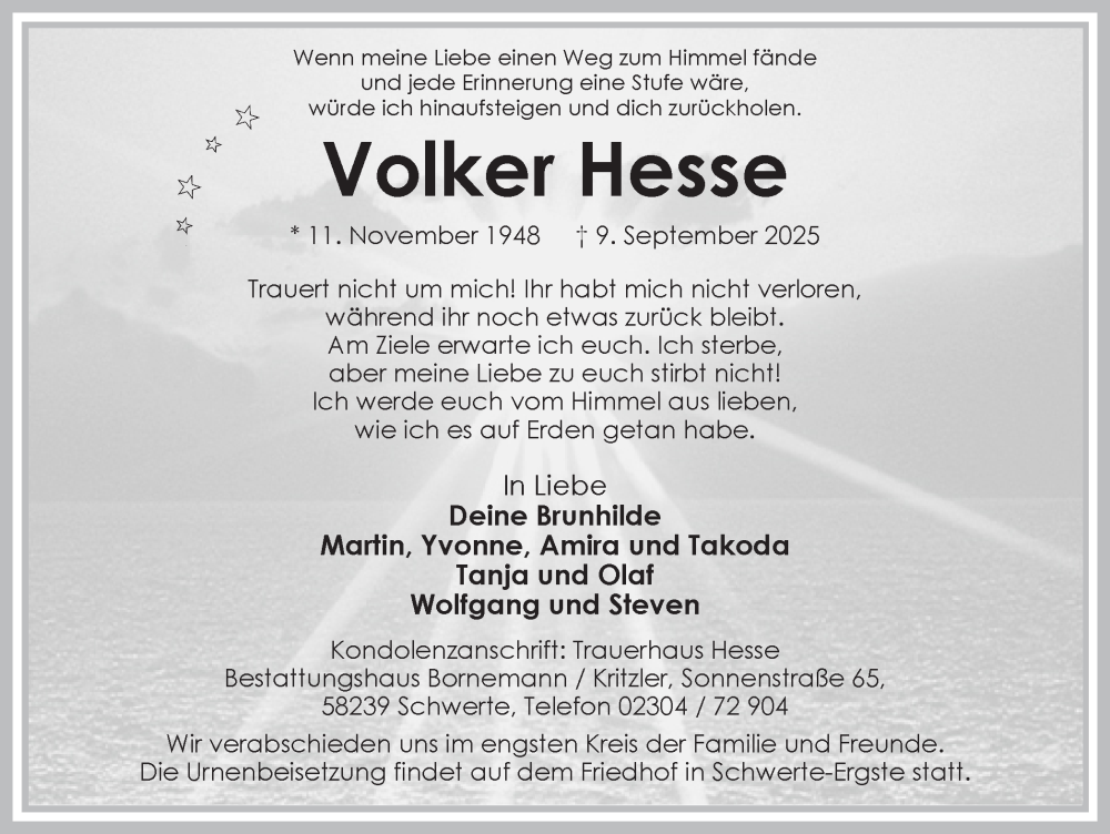 Hier finden Sie alle Traueranzeigen aus der Zeitung, die bisher für Volker Hesse erschienen sind. Weitere Traueranzeigen, die in der Zeitung erscheinen, werden hier ebenfalls aufgelistet