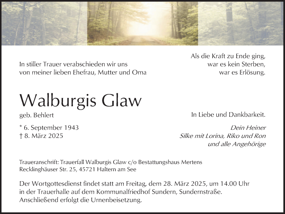 Hier finden Sie alle Traueranzeigen aus der Zeitung, die bisher für Walburgis Glaw erschienen sind. Weitere Traueranzeigen, die in der Zeitung erscheinen, werden hier ebenfalls aufgelistet