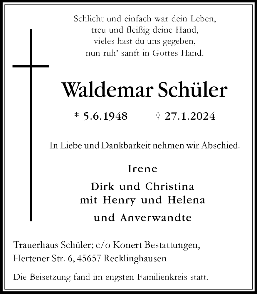 Hier finden Sie alle Traueranzeigen aus der Zeitung, die bisher für Waldemar Schüler erschienen sind. Weitere Traueranzeigen, die in der Zeitung erscheinen, werden hier ebenfalls aufgelistet