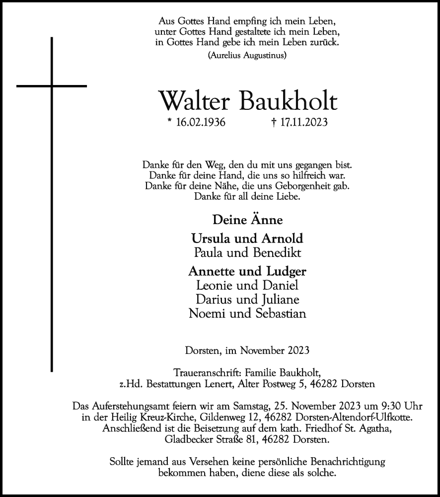 Hier finden Sie alle Traueranzeigen aus der Zeitung, die bisher für Walter Baukholt erschienen sind. Weitere Traueranzeigen, die in der Zeitung erscheinen, werden hier ebenfalls aufgelistet