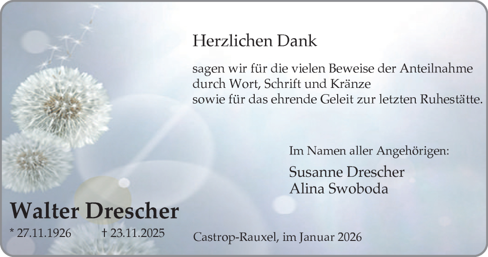 Hier finden Sie alle Traueranzeigen aus der Zeitung, die bisher für Walter Drescher erschienen sind. Weitere Traueranzeigen, die in der Zeitung erscheinen, werden hier ebenfalls aufgelistet