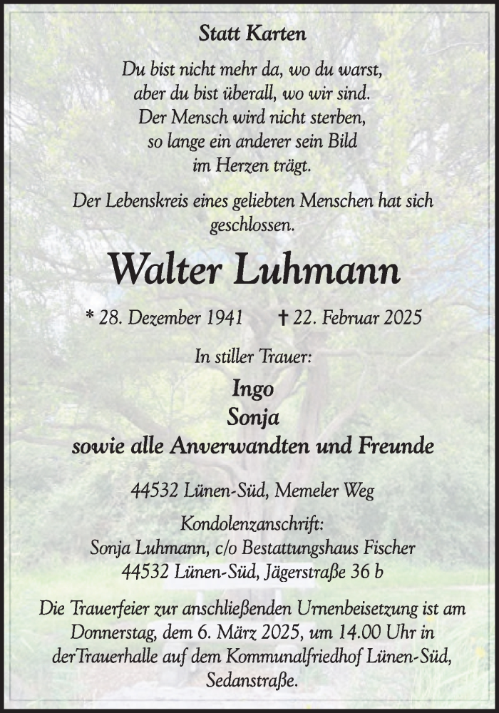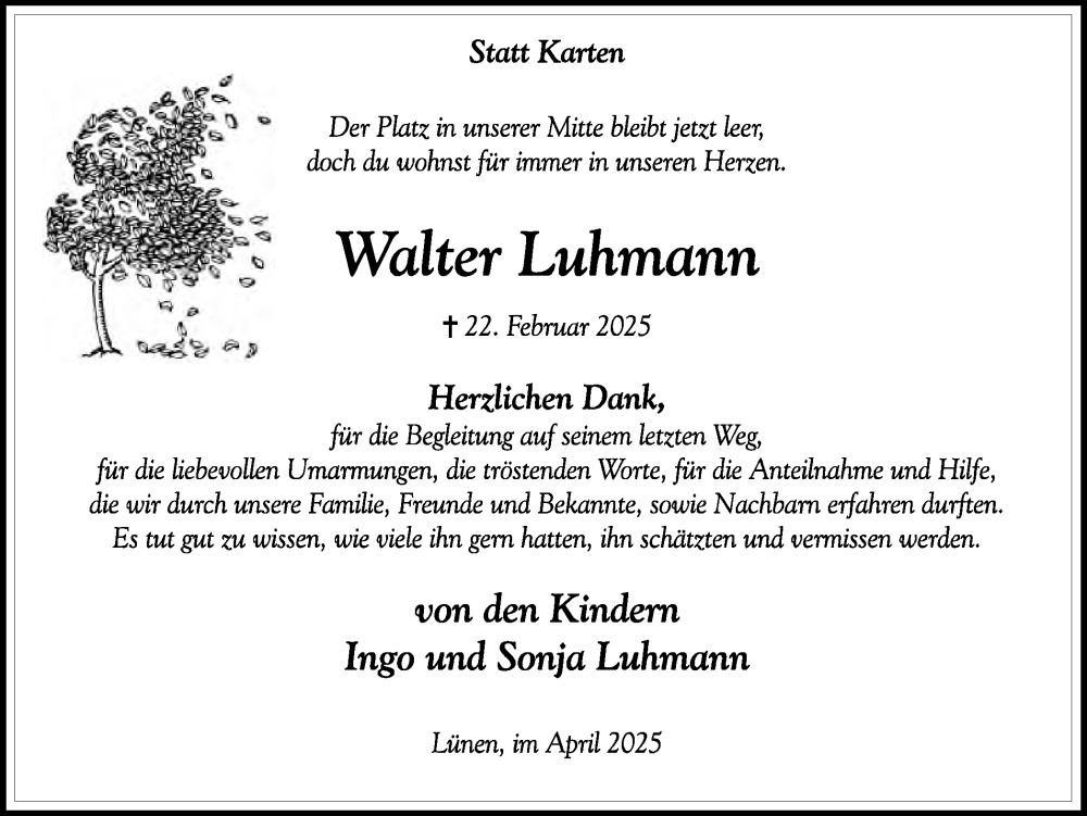 Hier finden Sie alle Traueranzeigen aus der Zeitung, die bisher für Walter Luhmann erschienen sind. Weitere Traueranzeigen, die in der Zeitung erscheinen, werden hier ebenfalls aufgelistet