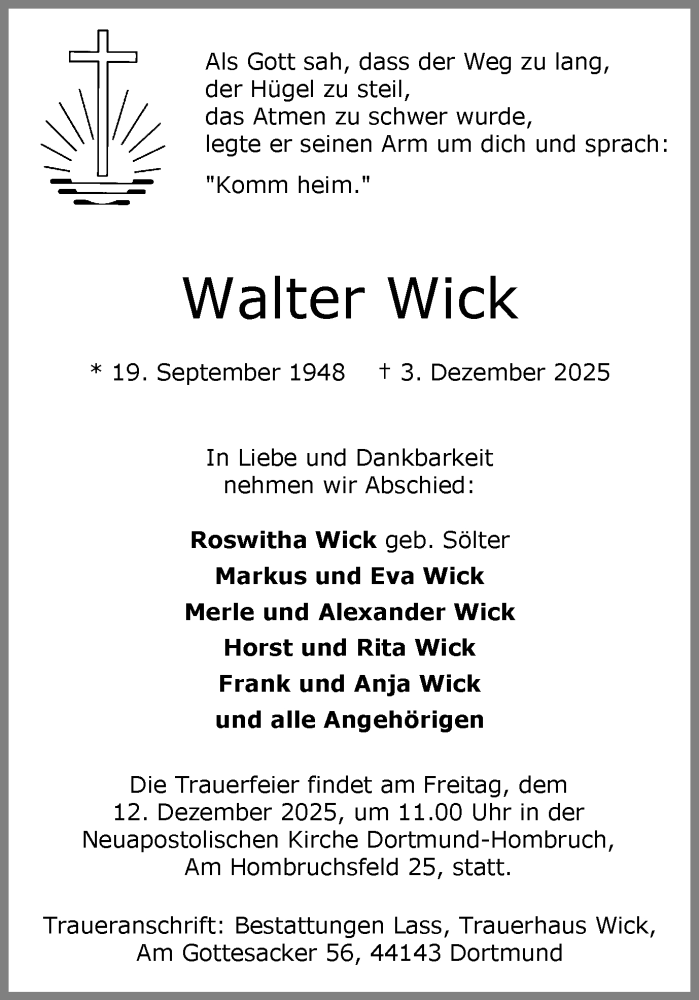 Hier finden Sie alle Traueranzeigen aus der Zeitung, die bisher für Walter Wick erschienen sind. Weitere Traueranzeigen, die in der Zeitung erscheinen, werden hier ebenfalls aufgelistet