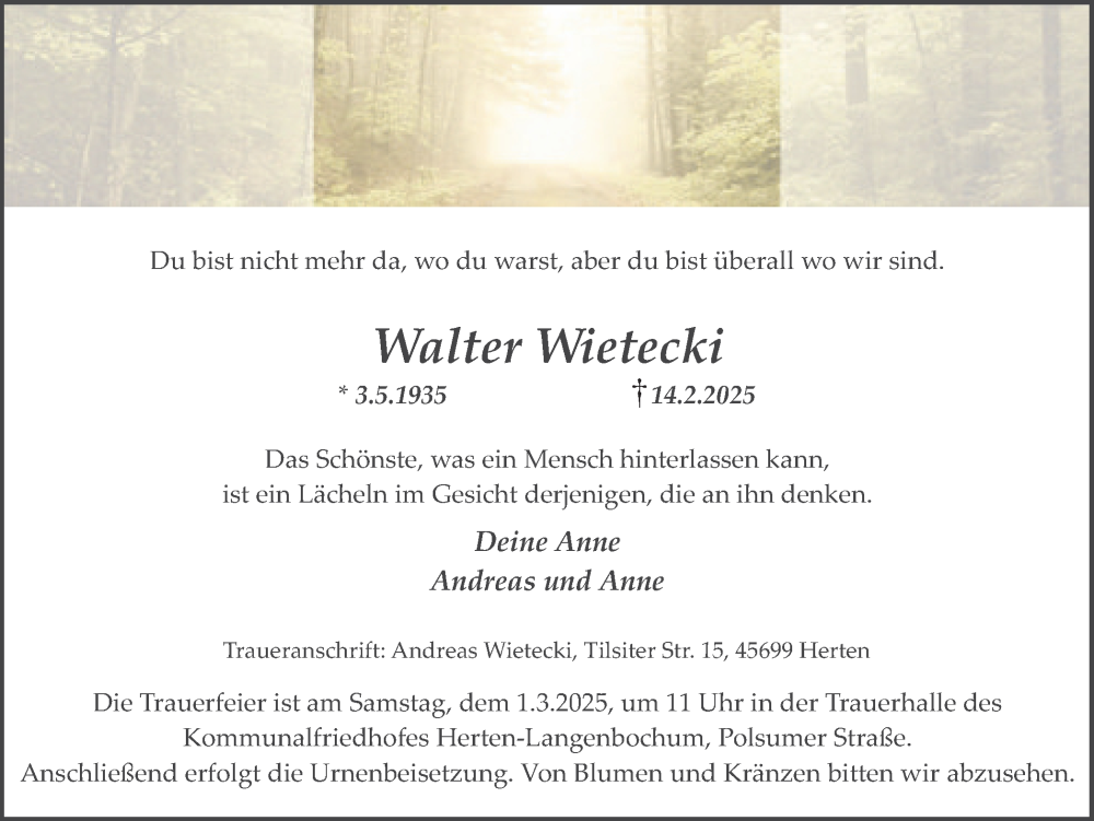 Hier finden Sie alle Traueranzeigen aus der Zeitung, die bisher für Walter Wietecki erschienen sind. Weitere Traueranzeigen, die in der Zeitung erscheinen, werden hier ebenfalls aufgelistet