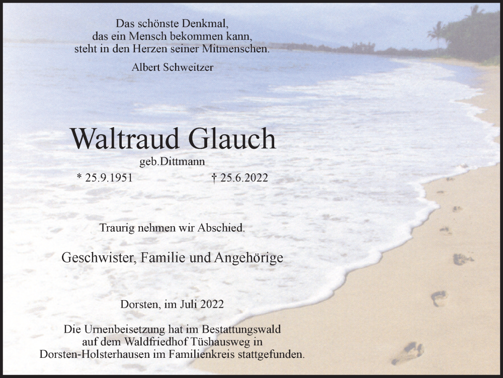 Hier finden Sie alle Traueranzeigen aus der Zeitung, die bisher für Waltraud Glauch erschienen sind. Weitere Traueranzeigen, die in der Zeitung erscheinen, werden hier ebenfalls aufgelistet