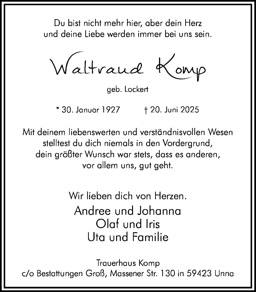 Hier finden Sie alle Traueranzeigen aus der Zeitung, die bisher für Waltraud Komp erschienen sind. Weitere Traueranzeigen, die in der Zeitung erscheinen, werden hier ebenfalls aufgelistet