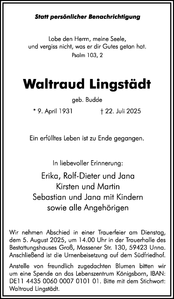 Hier finden Sie alle Traueranzeigen aus der Zeitung, die bisher für Waltraud Lingstädt erschienen sind. Weitere Traueranzeigen, die in der Zeitung erscheinen, werden hier ebenfalls aufgelistet