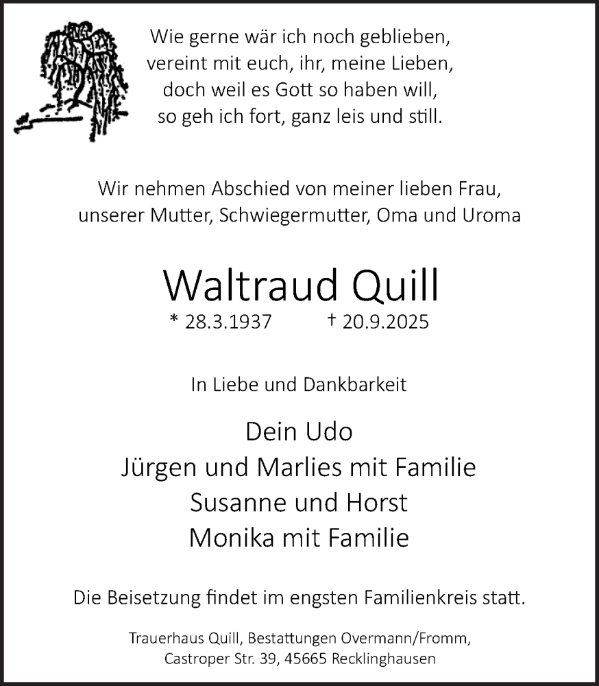 Hier finden Sie alle Traueranzeigen aus der Zeitung, die bisher für Waltraud Quill erschienen sind. Weitere Traueranzeigen, die in der Zeitung erscheinen, werden hier ebenfalls aufgelistet