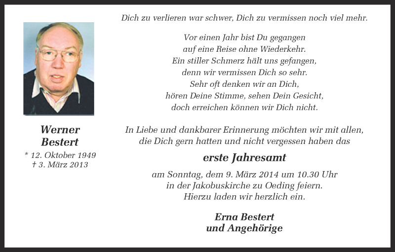 Hier finden Sie alle Traueranzeigen aus der Zeitung, die bisher für Werner Bestert erschienen sind. Weitere Traueranzeigen, die in der Zeitung erscheinen, werden hier ebenfalls aufgelistet