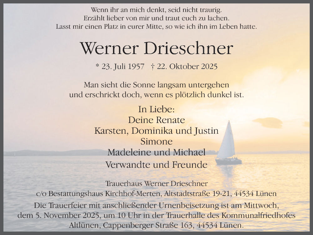Hier finden Sie alle Traueranzeigen aus der Zeitung, die bisher für Werner Drieschner erschienen sind. Weitere Traueranzeigen, die in der Zeitung erscheinen, werden hier ebenfalls aufgelistet