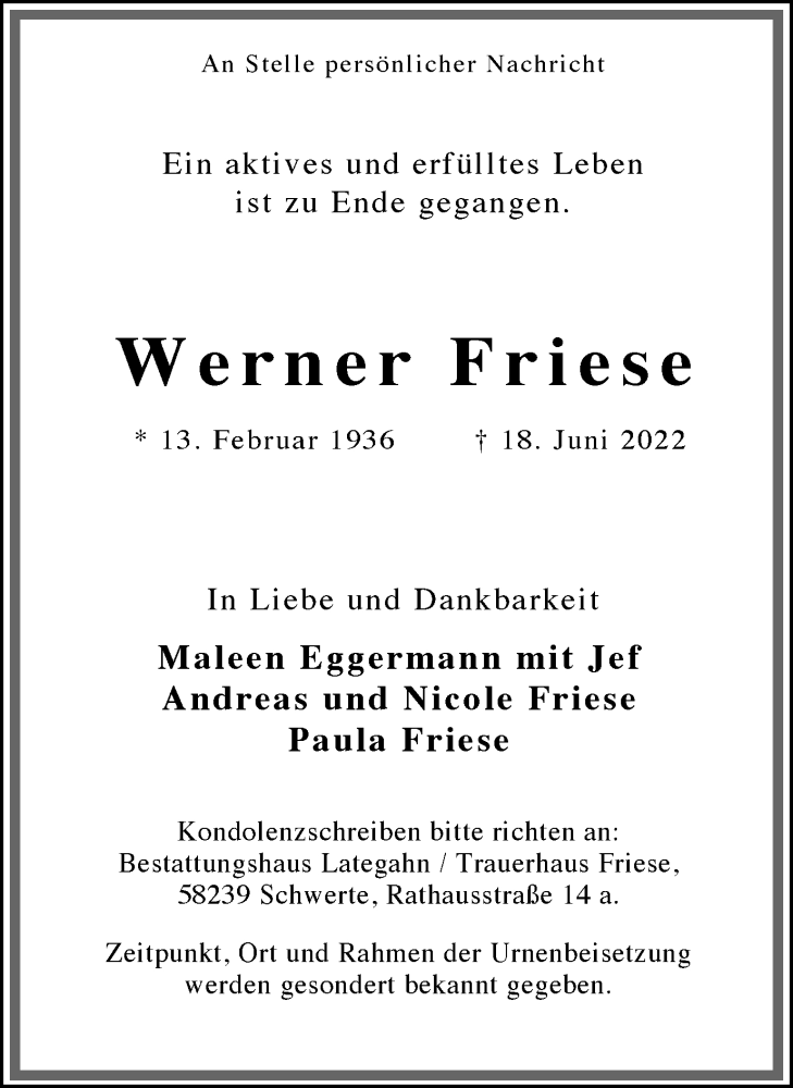 Hier finden Sie alle Traueranzeigen aus der Zeitung, die bisher für Werner Friese erschienen sind. Weitere Traueranzeigen, die in der Zeitung erscheinen, werden hier ebenfalls aufgelistet