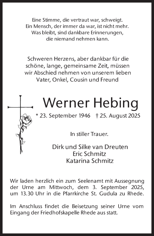 Hier finden Sie alle Traueranzeigen aus der Zeitung, die bisher für Werner Hebing erschienen sind. Weitere Traueranzeigen, die in der Zeitung erscheinen, werden hier ebenfalls aufgelistet
