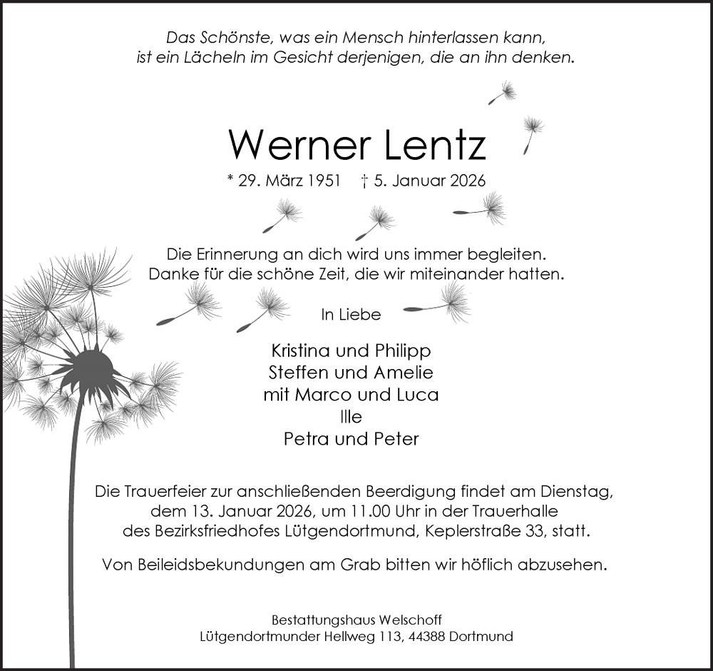 Hier finden Sie alle Traueranzeigen aus der Zeitung, die bisher für Werner Lentz erschienen sind. Weitere Traueranzeigen, die in der Zeitung erscheinen, werden hier ebenfalls aufgelistet