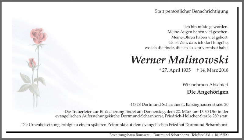 Hier finden Sie alle Traueranzeigen aus der Zeitung, die bisher für Werner Malinowski erschienen sind. Weitere Traueranzeigen, die in der Zeitung erscheinen, werden hier ebenfalls aufgelistet