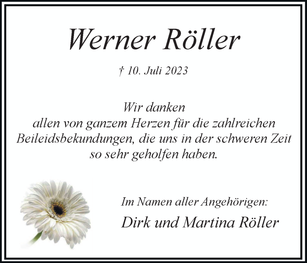 Hier finden Sie alle Traueranzeigen aus der Zeitung, die bisher für Werner Röller erschienen sind. Weitere Traueranzeigen, die in der Zeitung erscheinen, werden hier ebenfalls aufgelistet