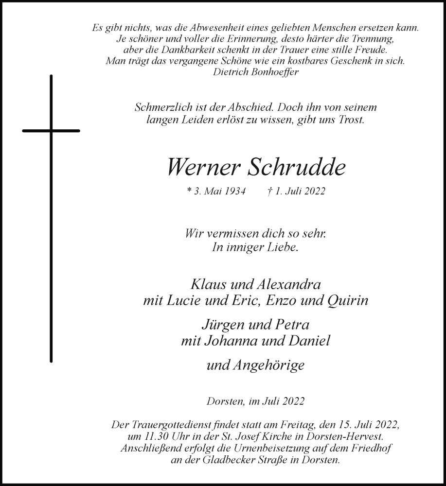 Hier finden Sie alle Traueranzeigen aus der Zeitung, die bisher für Werner Schrudde erschienen sind. Weitere Traueranzeigen, die in der Zeitung erscheinen, werden hier ebenfalls aufgelistet