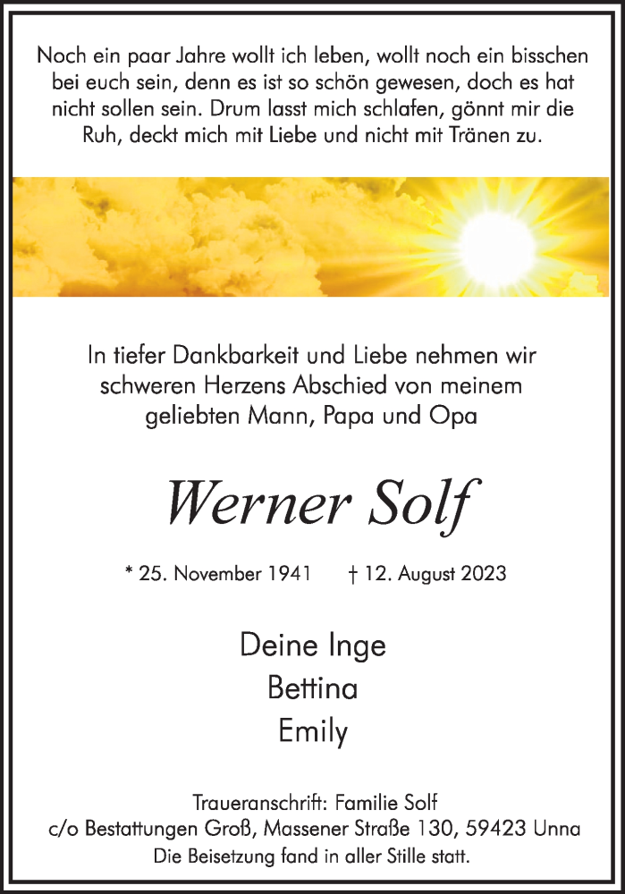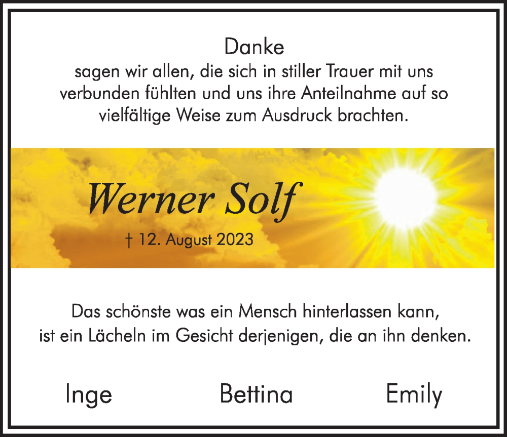 Hier finden Sie alle Traueranzeigen aus der Zeitung, die bisher für Werner Solf erschienen sind. Weitere Traueranzeigen, die in der Zeitung erscheinen, werden hier ebenfalls aufgelistet