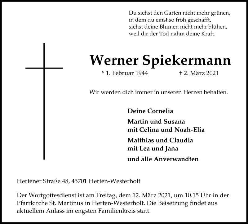 Hier finden Sie alle Traueranzeigen aus der Zeitung, die bisher für Werner Spiekermann erschienen sind. Weitere Traueranzeigen, die in der Zeitung erscheinen, werden hier ebenfalls aufgelistet