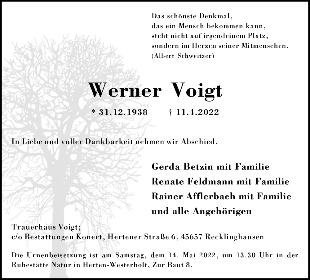 Hier finden Sie alle Traueranzeigen aus der Zeitung, die bisher für Werner Voigt erschienen sind. Weitere Traueranzeigen, die in der Zeitung erscheinen, werden hier ebenfalls aufgelistet