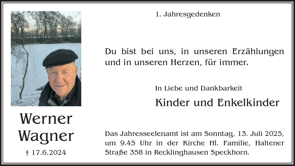 Hier finden Sie alle Traueranzeigen aus der Zeitung, die bisher für Werner Wagner erschienen sind. Weitere Traueranzeigen, die in der Zeitung erscheinen, werden hier ebenfalls aufgelistet