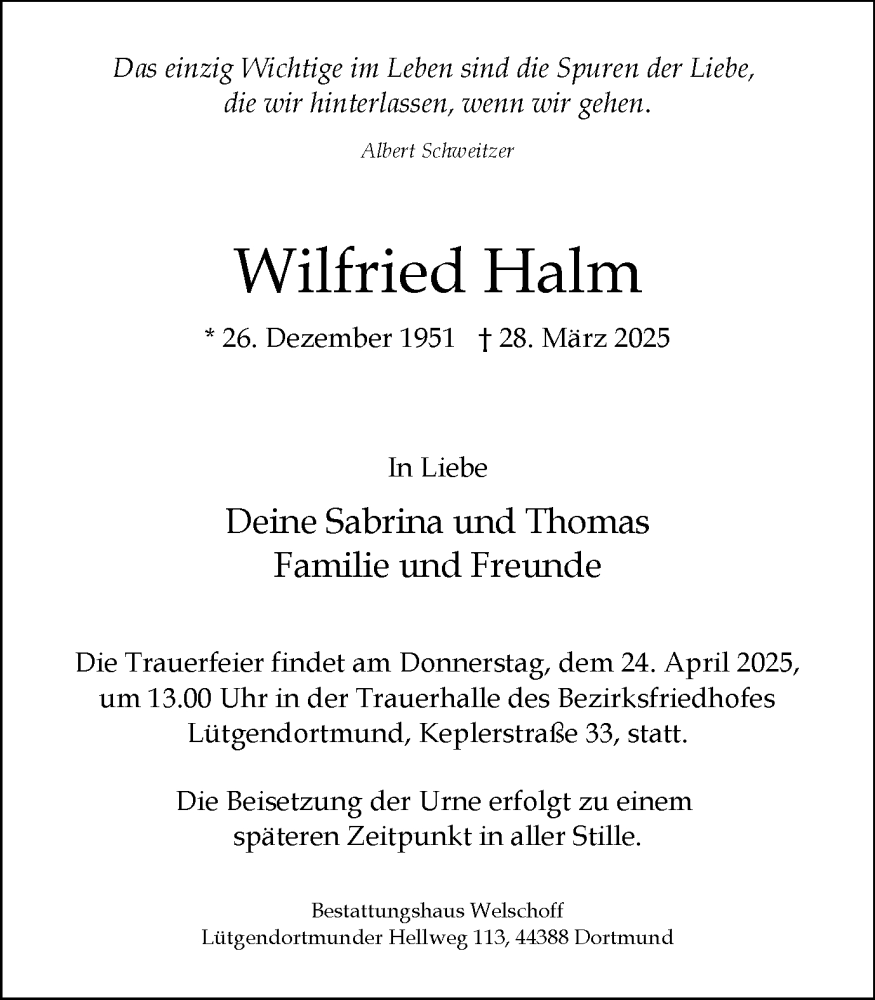 Hier finden Sie alle Traueranzeigen aus der Zeitung, die bisher für Wilfried Halm erschienen sind. Weitere Traueranzeigen, die in der Zeitung erscheinen, werden hier ebenfalls aufgelistet