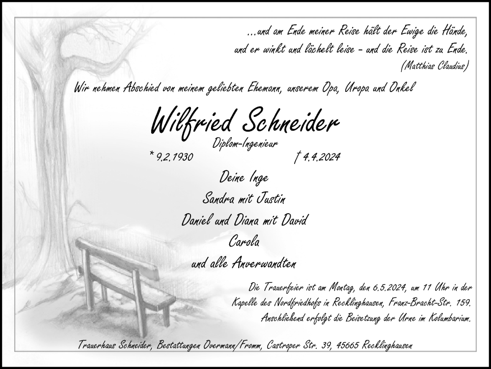 Hier finden Sie alle Traueranzeigen aus der Zeitung, die bisher für Wilfried Schneider erschienen sind. Weitere Traueranzeigen, die in der Zeitung erscheinen, werden hier ebenfalls aufgelistet