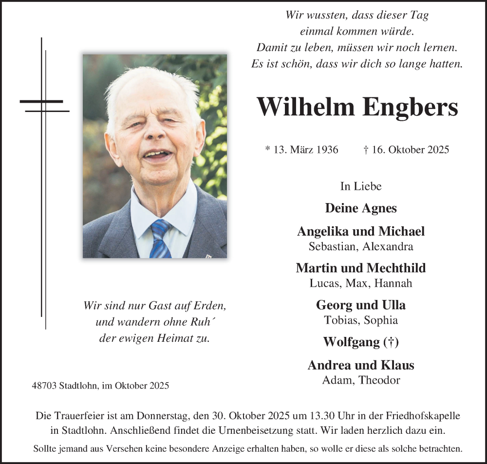 Hier finden Sie alle Traueranzeigen aus der Zeitung, die bisher für Wilhelm Engbers erschienen sind. Weitere Traueranzeigen, die in der Zeitung erscheinen, werden hier ebenfalls aufgelistet